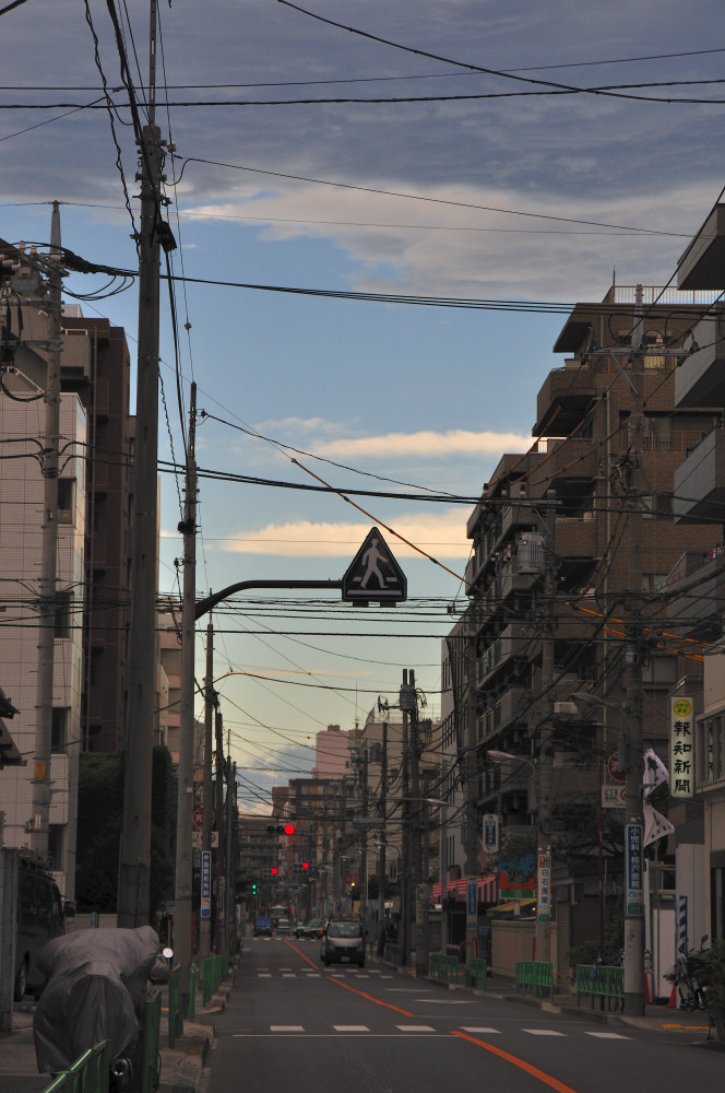 夜勤の話をまだ引きずって、現場が終わり、事務所に戻ってシャワーを浴びて事務所を後にした時。空は厚い雲がかかっていてそれこそ鉛色。始発電車に乗るために駅に向かって国道まで一直線に伸びる路地に出ると、遠くの空が綺麗に輝いていた。