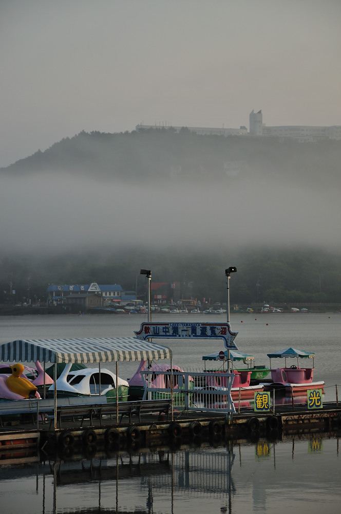 少し霧もかかっていた。ボートの発着場を見ると、空と湖の間に、霧の幕が綺麗に出来ていた。気温は18度。少し肌寒いくらいだった。