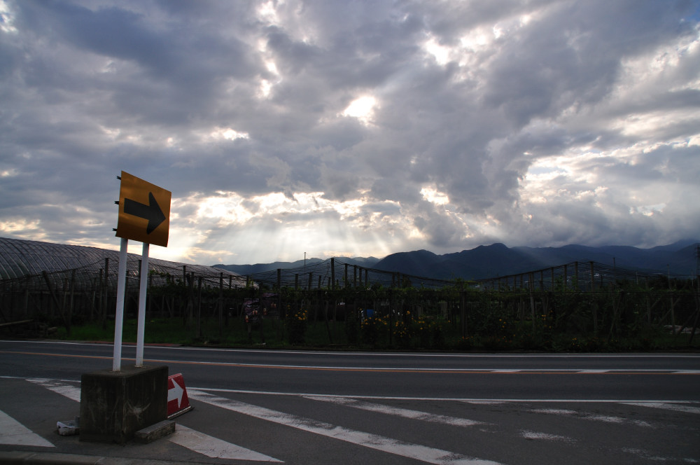 2日目の夕方、家族で観光(実は僕は山梨の観光名所というのを全く知らないのです)もどきでブラブラしていると、突然青空に雲が集まりだし、薄暗くなったかと思うと、雲の隙間から光がこぼれ出しました。
