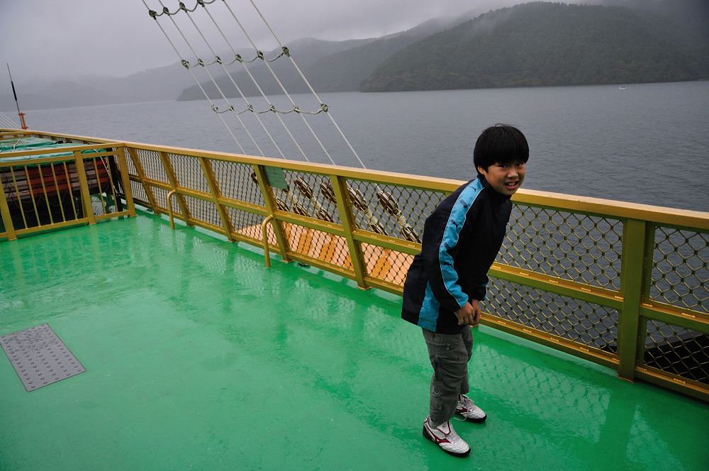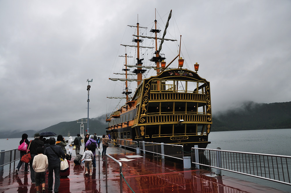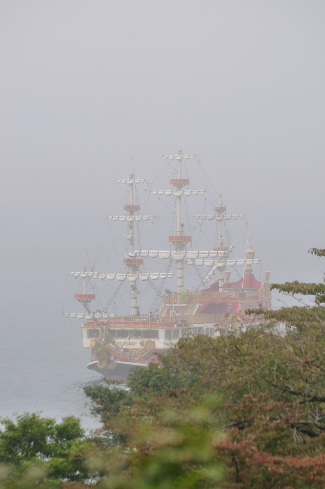 食事を終えて部屋に戻ると、窓から芦ノ湖が見え、そこには昨日乗った海賊船の別タイプの船がゆっくりと出港していった。