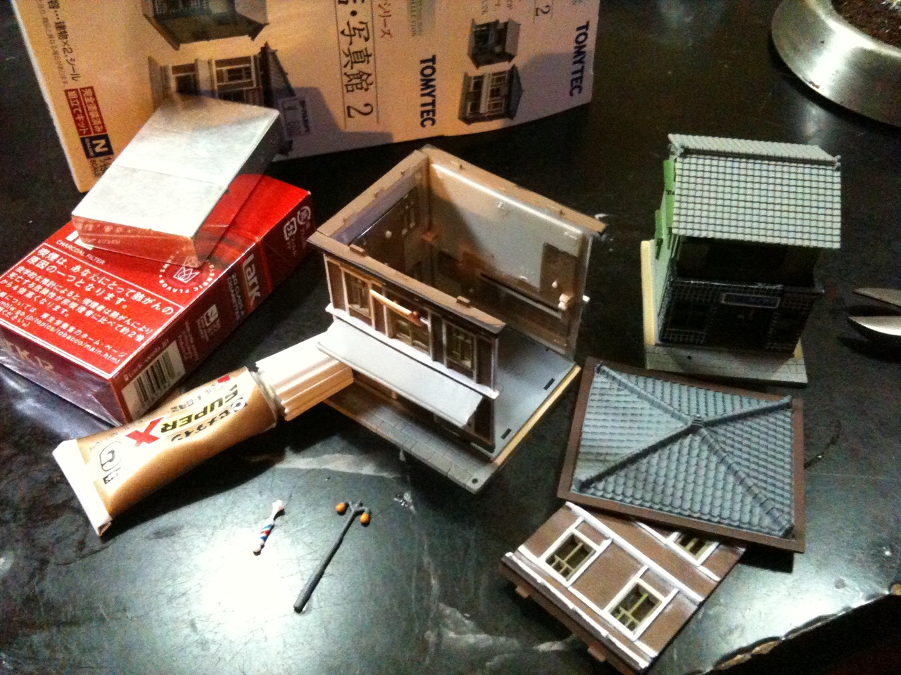 いわゆる鉄道模型のジオラマ(鉄道模型界では「レイアウト」と言う)に設置する為の、街に良くある建物の模型なんだけど、確かNゲージは1/160なのでかなり小さいのだが、小さいから、細かいから難しいと思ったらさにあらず(最近「さにあらず」って使わないよね)それこそ本当に簡単なキットなので、5分もしないで完成。テーブルの上に並べて一人歓喜をあげる。娘は横目で苦笑していた。