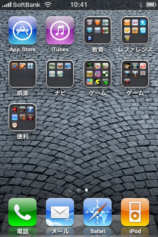 iOS4で大きく変わったのは、アイコンをまとめて「フォルダ」を作れるようになった事だろうか。アイコン長押しでブルブルさせたら、アイコン同士を重ね合わせるようにする事でフォルダを作成出来る。フォルダの名前は勝手にiPhoneがつけてくれる(気に入らなければもちろん名前は変更可能)。1個のフォルダに12個までのアプリが入るので、かなり纏める事が可能だ。