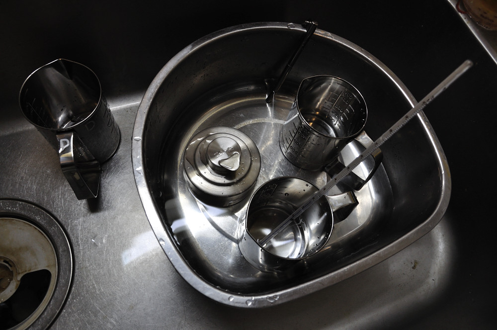 作業場所ですが、水が調達出来るところなら、何処でも良いです。キッチン、洗面所、お風呂場、もしかしたらトイレでもOKです。僕の場合はキッチンです。僕がキッチンでやる理由というのは、現像処理、特にその中でも現像液の処理は液温がとても大事になります。そうなると、室温も処理液温に近いのが望ましいので、冬なら暖房、夏なら冷房の効くキッチンで作業します。バット、もしくは桶に処理温度と同じ温度の水を少量張って、その中に処理液を入れたビーカーを入れて温度を保つのです。