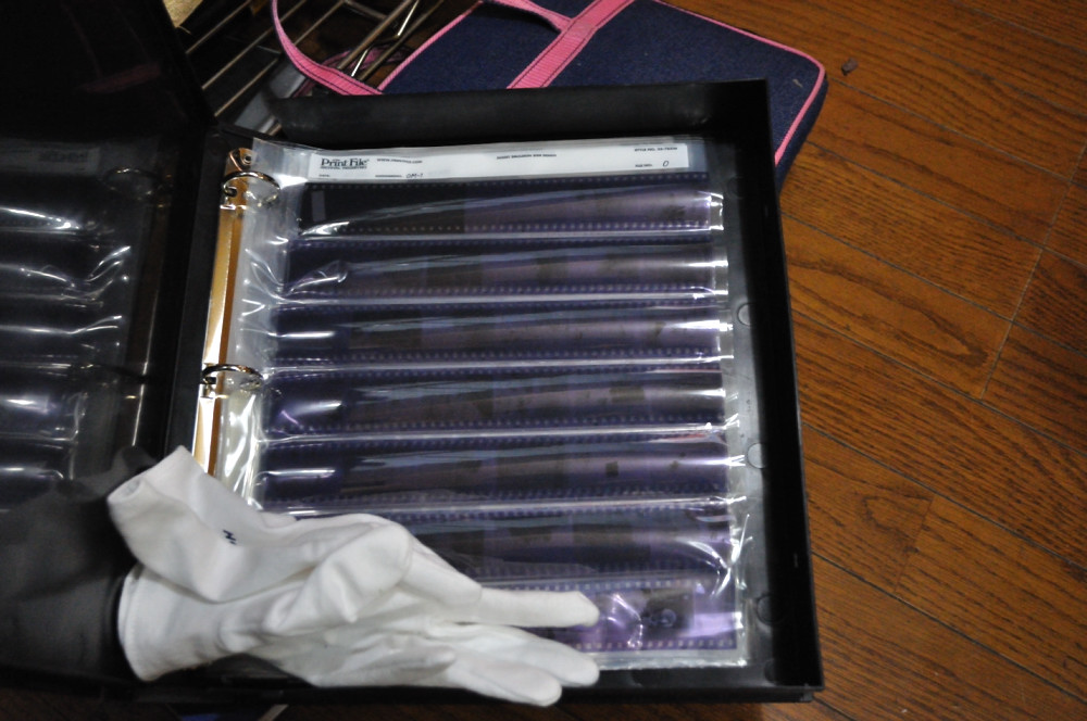 乾燥が終わったら、指紋が付かないように手袋をして(これも写真用品店に売ってます)、6コマ毎に切断してネガシートに入れます。白い手袋をすると世代によっては踊りたくなるかもしれませんが、そこはグッと我慢して下さい。