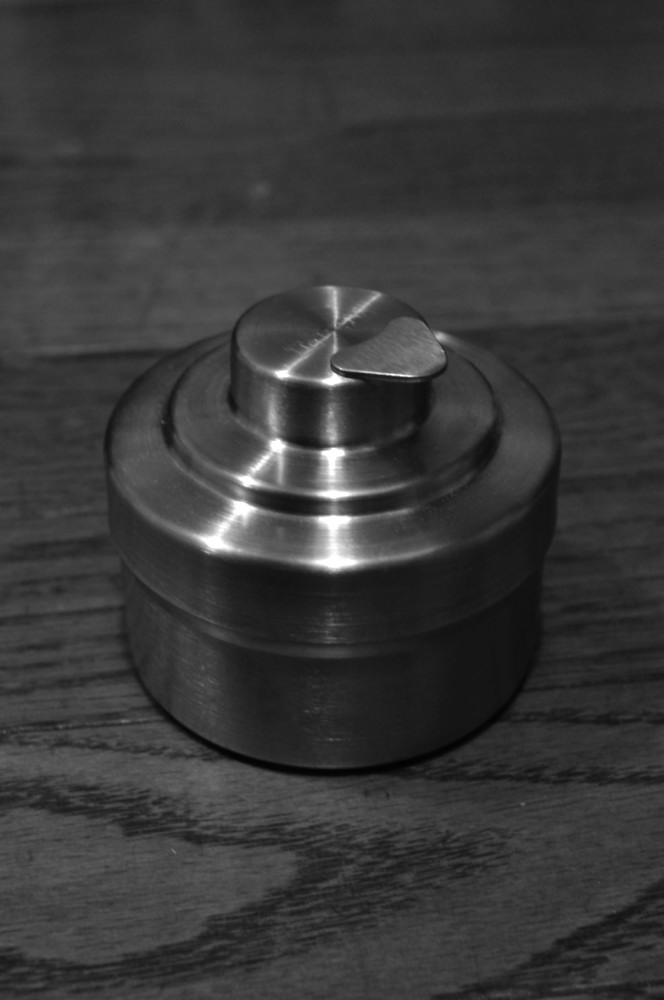 某オークションで、オールステンレスの新品を入手しました。ほぼ定価でしたが(汗)。35ミリフィルム一本用のタンクですね。