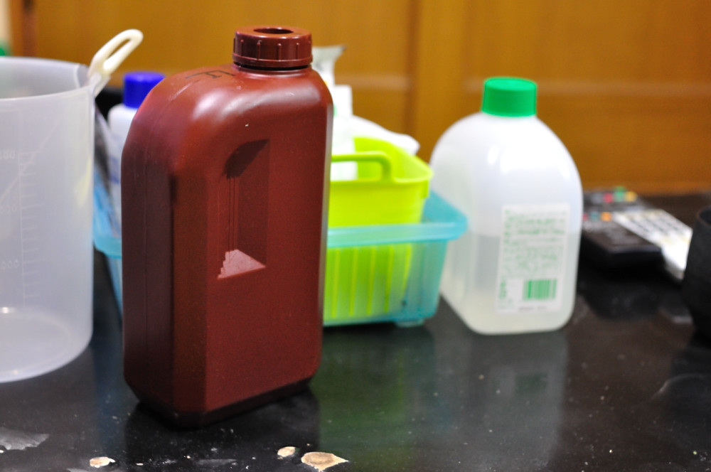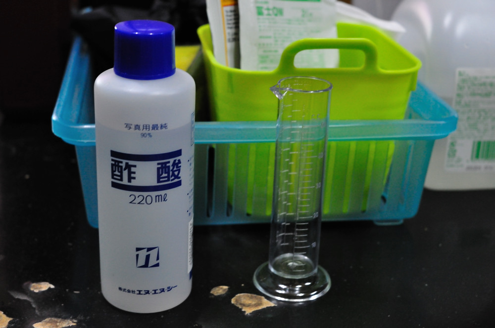 現像液はアルカリ性なので、現像行為をストップさせるために、酸性の液体で進行を止めると言うわけです。メジャーな所では「酢酸」です。知らなかったのですが石墨さんに教えて貰ったところ、クエン酸での停止も最近メジャーなようで、写真用品屋さんに売っていました。まあ、酸性ならなんでも良いのかも知れません(テキトーですね)。実際はタダの水でもオッケーです。ま、諸々の理由で(特に精神的)一度は水停止を考えましたが、学生の頃も使っていた酢酸で停止液を作ります。