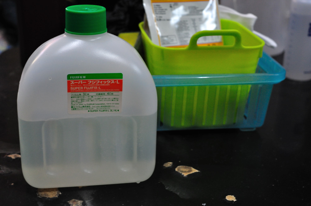 定着液も色々種類が出ていますが、印画紙現像をしない僕は硬膜処理剤(っていうのかな)が配合されている、富士フィルム制の迅速定着液です。