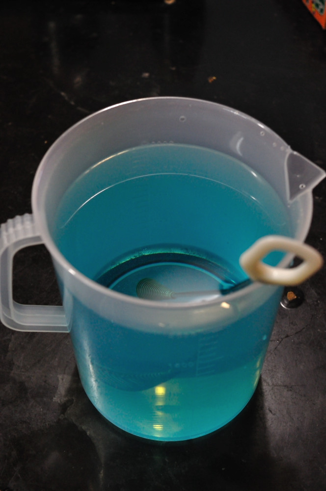 出来上がった使用液は綺麗な水色になります。綺麗ですね。でも、間違ってもこれをかき氷に掛けたりしないで下さい。絶対にブルーハワイの味にはなりませんからね。