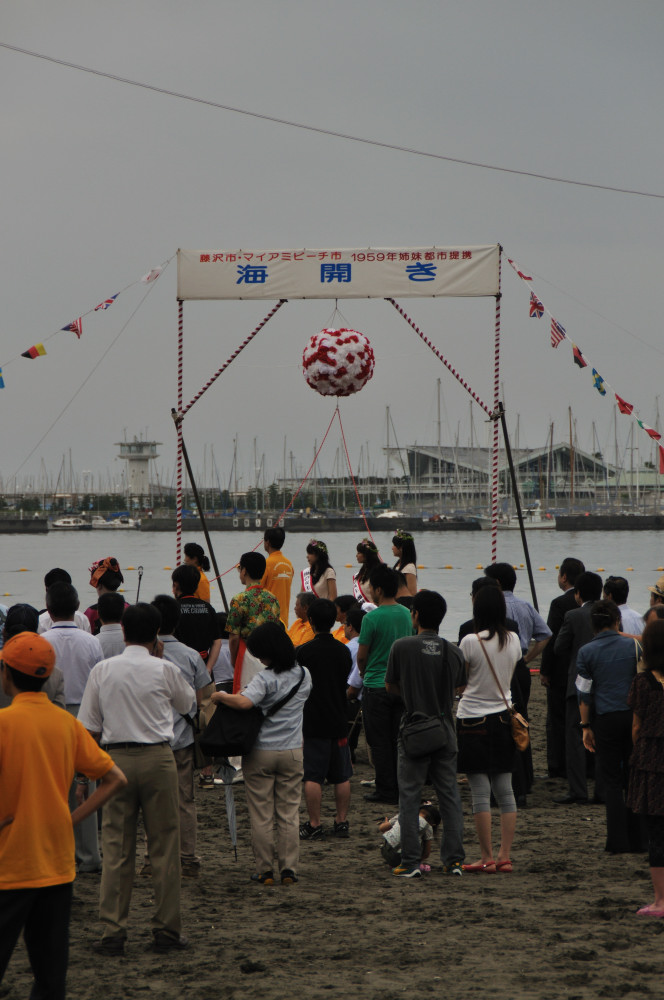 まず片瀬江ノ島へロマンスカーで到着。由比ヶ浜へ向かうと、偶然海開きのイベントが開催されていた。